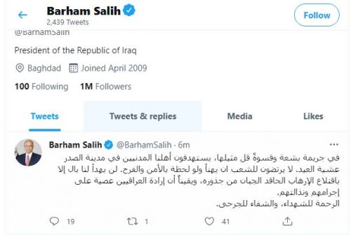 صالح يعلق بشأن تفجير مدينة الصدر: جريمة بشعة وقسوةٌ قل مثيلها
