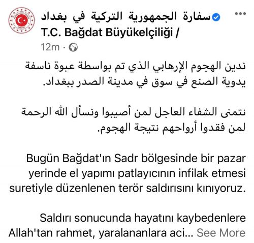 السفارة التركية في بغداد تدين تفجير مدينة الصدر