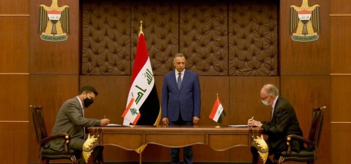رعا رئيس الوزراء مصطفى الكاظمي، السبت، مراسم توقيع بيع مليون طن من مادة زيت الوقود الثقيل بالسعر العالمي الى لبنان.