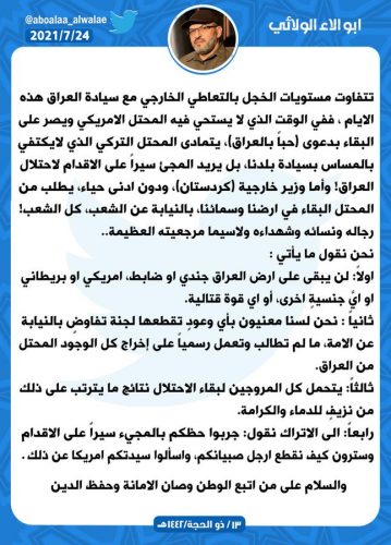 رابعاً: الى الاتراك نقول: جربوا حظكم بالمجيء سيراً على الاقدام وسترون كيف نقطع ارجل صبيانكم، واسألوا سيدتكم امريكا عن ذلك والسلام على من اتبع الوطن وصان الامانة وحفظ الدين. انتهى