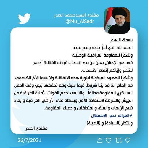 الصدر يعلق على نتائج الحوار الاستراتيجي: العراق نحو الاستقلال