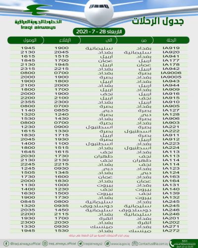 بالجدول.. مواعيد رحلات الخطوط الجوية العراقية ليوم غد الاربعاء