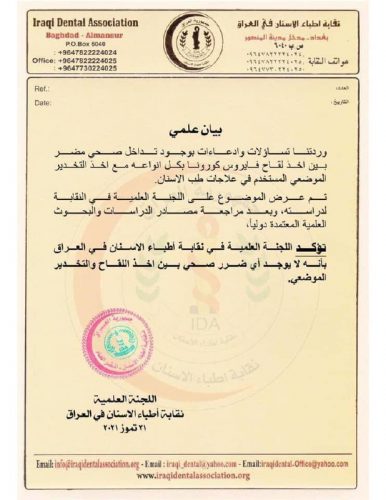 بالوثيقة.. نقابة اطباء الاسنان تصدر توضيحا بشأن أخذ اللقاح والتخدير الموضعي