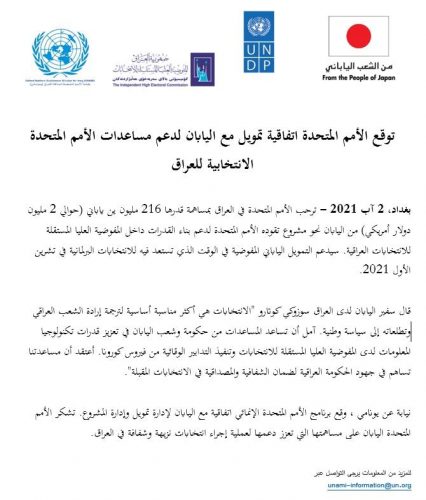 وأضافت الوثيقة، “نيابة عن يونامي ، وقع برنامج الأمم المتحدة الإنمائي اتفاقية مع اليابان الإدارة تمويل وإدارة المشروع. تشكر الأمم المتحدة اليابان على مساهمتها التي تعزز دعمها لعملية إجراء انتخابات نزيهة وشفافة في العراق”. انتهى