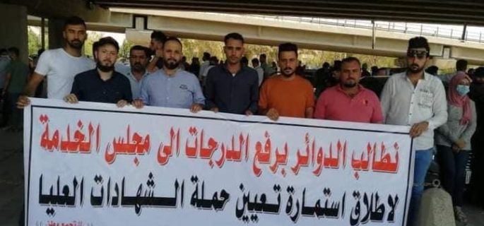 وشهدت العاصمة بغداد اليوم، تظاهرةً للخريجين الأوائل وحملة الشهادات قرب مقر وزارة المالية للمطالبة بتعيينهم في وزارات ومؤسسات الدولة.