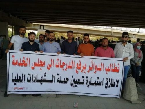 وشهدت العاصمة بغداد اليوم، تظاهرةً للخريجين الأوائل وحملة الشهادات قرب مقر وزارة المالية للمطالبة بتعيينهم في وزارات ومؤسسات الدولة.