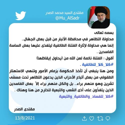 الصدر مغردا: مظاهرات الانبار محاولة لإثارة الفتنة الطائفية