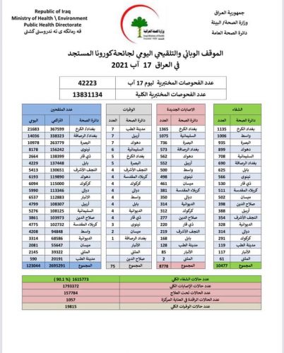 الصحة تسجل 8778 اصابة جديدة بكورونا