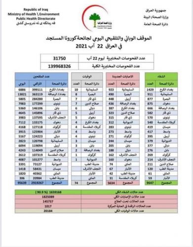 الصحة تسجل 5634 اصابة جديدة بكورونا