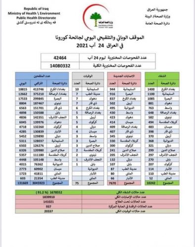 الصحة تسجل 7670 اصابة جديدة بكورونا