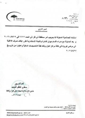 بالوثيقة.. صحة ذي قار توقف صرف الاغذية لمرضى كورونا