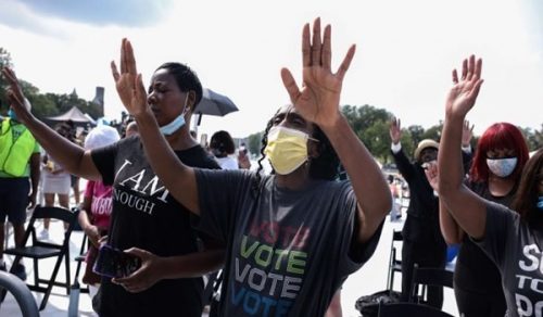 ورفع المتظاهرون في واشنطن الذين ساروا من محيط البيت الأبيض إلى سفح هضبة الكابيتول مبنى الكونغرس في أجواء من الحر والرطوبة، لافتات كتب عليها “حقوق التصويت للجميع” و”التصويت مقدس”.