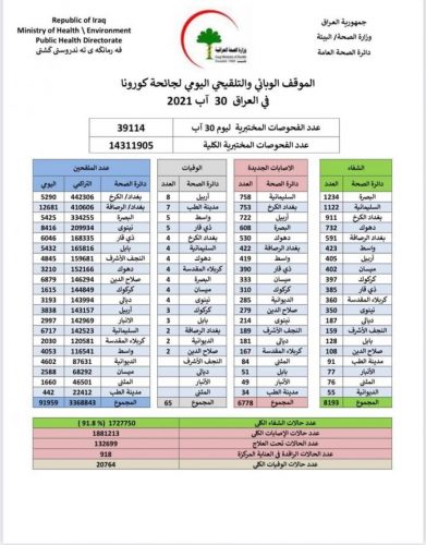 الصحة تسجل 6778 اصابة جديدة بكورونا