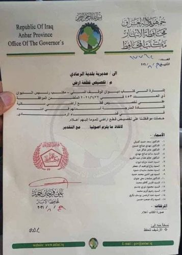 بالوثيقة : رئيس ديوان الوقف السني يخصص لنفسه و 14 آخرين قطع أراض في الرمادي