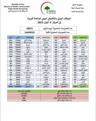 الصحة تسجل 4316 اصابة جديدة بفيروس كورونا