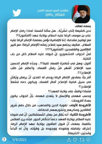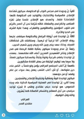 الصدر: عدم وجودنا في البرلمان والحكومة بمثابة طلقة الرحمة في صدر الإصلاح