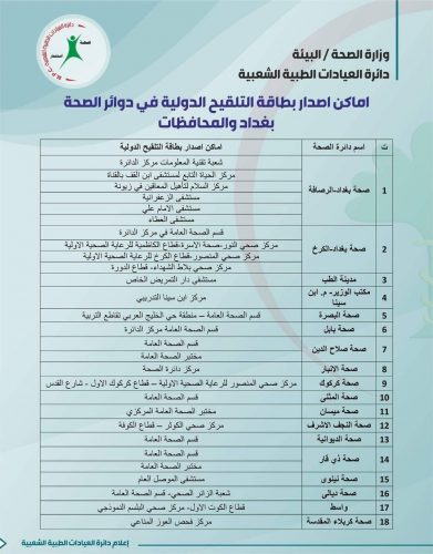 بالوثيقة.. أماكن إصدار بطاقة التلقيح الدولية في بغداد والمحافظات