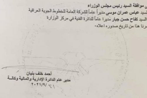 بالوثيقة.. أمر وزاري بتغيير مدير شركة الخطوط الجوية العراقية
