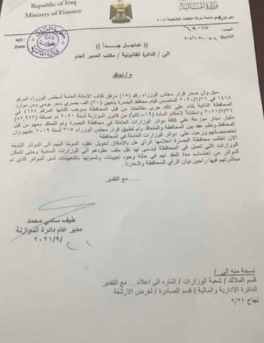 بالوثيقة.. توجيه حكومي بتحويل ٣٠ الف درجة وظيفية الى عقود وزارية في البصرة