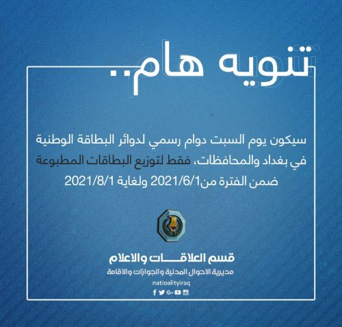 وذكرت المديرية، في بيان تلقت *الرأي* الدولية نسخة منه، أنه “بتوجيه من مدير عام الاحوال المدنية والجوازات والاقامة اللواء رياض جندي الكعبي، تقرر ان يكون يوم السبت دوام لكوادر شعبة تسليم البطاقة الوطنية فقط في بغداد والمحافظات لغرض تسليم البطاقات المنجزة للمواطنين، ويكون موعد التسليم بعد الساعة الواحدة ظهراً”.