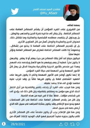 الصدر: الإصلاح هو الباب الوحيد لإنقاذ العراق من الاحتلال والتطبيع والتبعية
