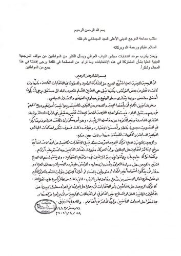 وختم البيان، تؤكد المرجعية على القائمين بأمر الانتخابات أن يعملوا على اجرائها في أجواء مطمئنة بعيدة عن التأثيرات الجانبية للمال او السلاح غير القانوني أو التدخلات الخارجية، وأن يراعوا نزاهتها ويحافظوا على أصوات الناخبين فإنها أمانة في أعناقهم. والله وليّ التوفيق. انتهى