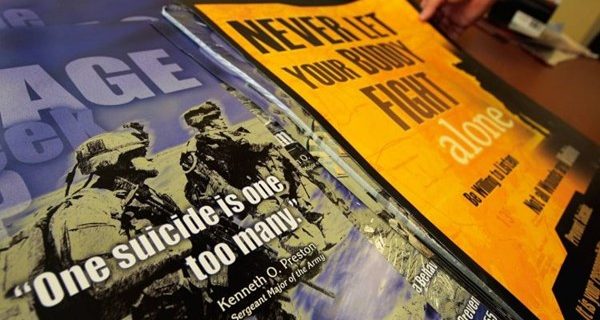 يذكر ان الجيش الامريكي كان يستخدم ملصقات دعائية في المعسكرات تحث الجنود على عدم الانتحار والتواصل مع المراكز الطبية في مواجهة تحديات الصحة العقلية .انتهى