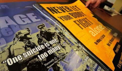 يذكر ان الجيش الامريكي كان يستخدم ملصقات دعائية في المعسكرات تحث الجنود على عدم الانتحار والتواصل مع المراكز الطبية في مواجهة تحديات الصحة العقلية .انتهى