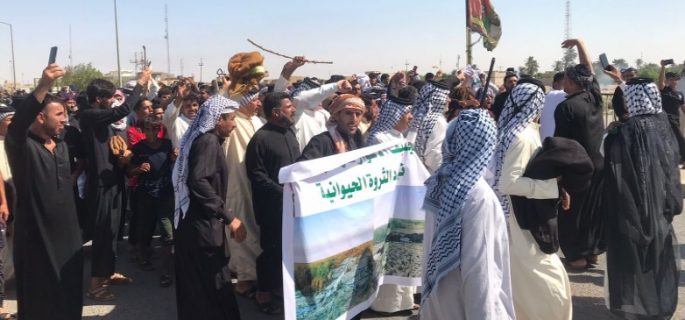 تظاهر أهالي محافظة ميسان، الأحد، بالقرب من ناظم الكحلاء للمطالبة بإطلاق الحصة المائية، بعد تعرض أرهاضيهم للجفاف.