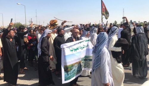 تظاهر أهالي محافظة ميسان، الأحد، بالقرب من ناظم الكحلاء للمطالبة بإطلاق الحصة المائية، بعد تعرض أرهاضيهم للجفاف.