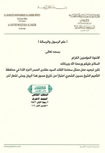 بالوثيقة.. الصدر يجمد عمل ممثله في كركوك