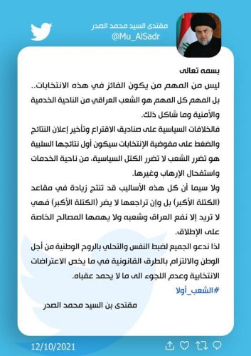 الصدر يدعو لضبط النفس والالتزام بالطرق القانونية فيما يخص الاعتراضات الانتخابية