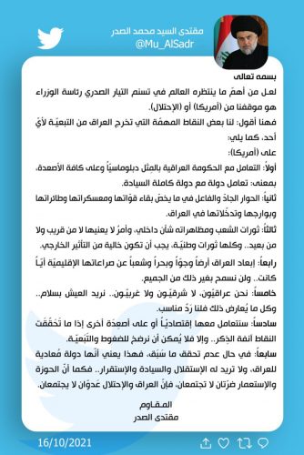 مقتدى الصدر يتحدث عن منصب رئيس الوزراء ويحدد 7 نقاط لاخراج العراق من التبعية