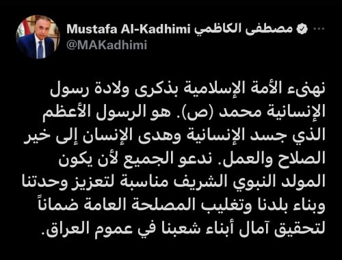 الكاظمي: ندعو الجميع لأن يكون المولد النبوي مناسبًا لوحدتنا وبناءنا وتغليب المصلحة العامة