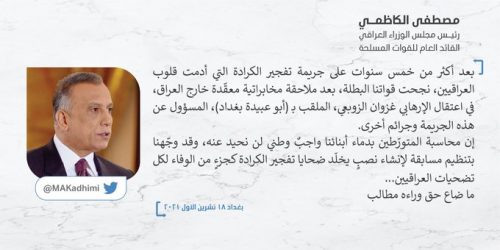 وقال الكاظمي في تغريدة عبر تويتر “بعد أكثر من خمس سنوات على جريمة تفجير الكرادة التي أدمت قلوب العراقيين، نجحت قواتنا البطلة، بعد ملاحقة مخابراتية معقّدة خارج العراق، في اعتقال الإرهابي غزوان الزوبعي، الملقب بـ (أبو عبيدة بغداد)، المسؤول عن هذه الجريمة وجرائم أخرى”.