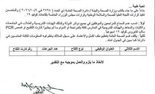 بالوثيقة.. صحة الأنبار توجه بمنع دخول الموظفين والمراجعين لدوائرها دون بطاقة تلقيح