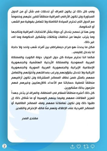 الصدر يحدد مستويين للتعامل مع الجوار ويضع 3 نقاط للمتدخلين بشؤون العراق