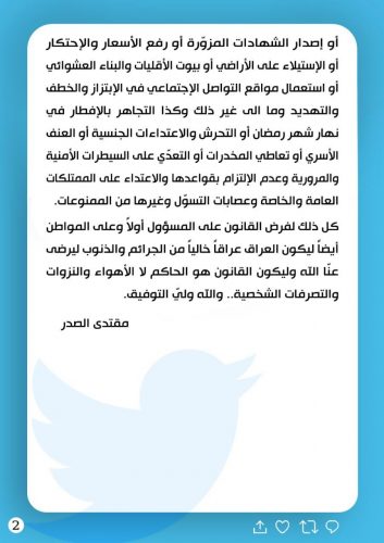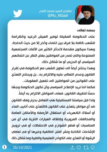 مقتدى الصدر يصدر توصيات للحكومة المقبلة