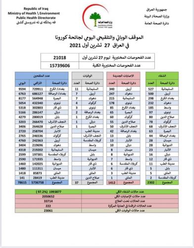 الصحة تسجل 1412 إصابة جديدة بكورونا