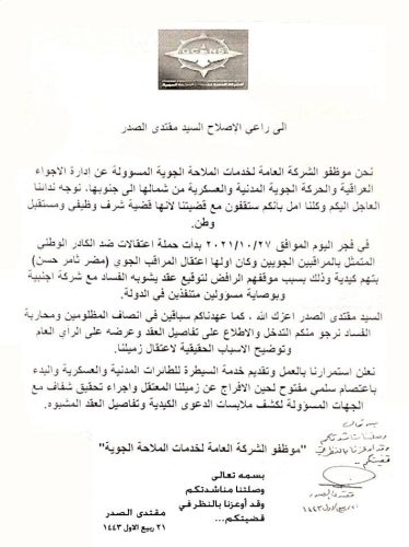 بالوثيقة : الصدر يصدر أمرا يخص موظفي الشركة العامة لخدمات الملاحة الجوية