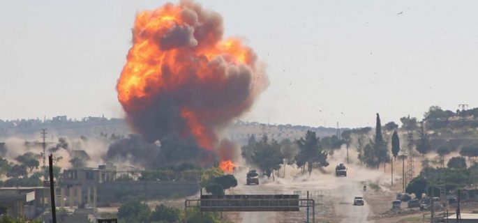 A fireball erupts from the site of an explosion reportedly targeting a joint Turkish-Russian patrol on the strategic M4 highway, near the Syrian town of Ariha in the rebel-held northwestern Idlib province, on July 14, 2020. (Photo by Mohammed AL-RIFAI / AFP)