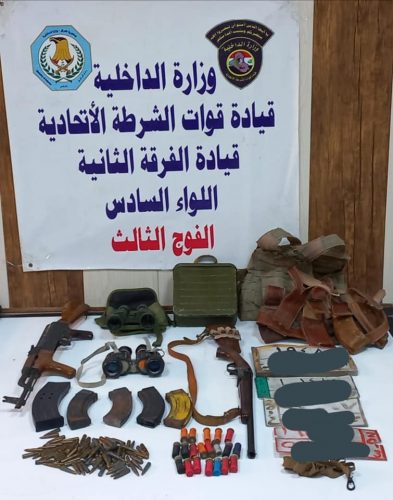 واضافت، انه”في السياق ذاته نفذت قوة من اللواء الرابع الفرقة الأولى شرطة اتحادية بالاشتراك مع مفارز استخبارات الفوج الثالث للواء عملية تفتيش على السلاح غير المرخص في منطقة (جسر ديالى) جنوب شرق بغداد تم خلالها العثور على 4 بندقية مختلفة الانواع، 11 مخزن بندقية، 43 إطلاقة بندقية، مسدس صوتي، 68 إطلاقة مسدس، جهاز DVR، بايب زجاجي يستخدم للتعاطي، 5 جعبة مخازن بندقية وتم ضبط جميع المواد والتعامل معها اصولياً”.انتهى