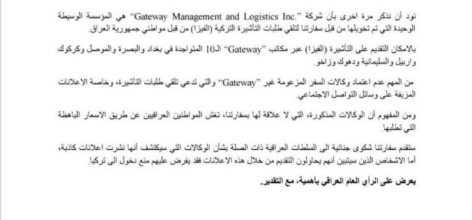 بالوثيقة ..السفارة التركية تصدر تنبيها هاما بشأن منح الفيزا للعراقيين