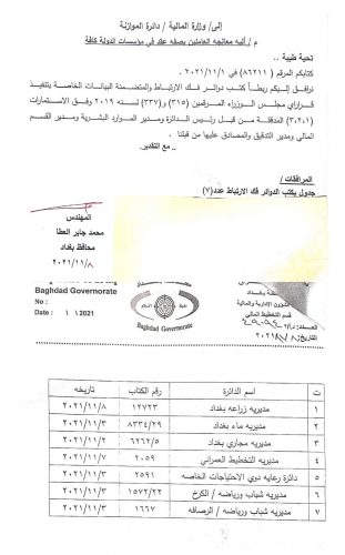 بالوثيقة.. محافظة بغداد ترسل بيانات الاجور اليومية إلى وزارة المالية