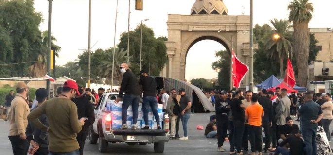 وبحسب مقطع فيديو فأن المعتصمون نصبوا خيمهم امام بوابة المطقة الخضراء من جهة وزارة التخطيط بشكل مباشر.