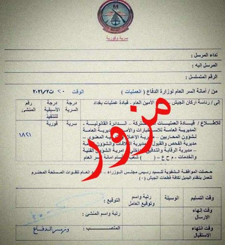 وذكر بيان للوزارة تلقت *الرأي* الدولية نسخة منه، انه تناقلت بعض صفحات مواقع التواصل الاجتماعي خلال الساعات الماضية كتاباً مزوراً بخصوص “موافقة السيد القائد العام للقوات المسلحة على عودة نظام البديل للإجازات”، وتوكد وزارة الدفاع أن هذا الكتاب غير صحيح ومزور.
