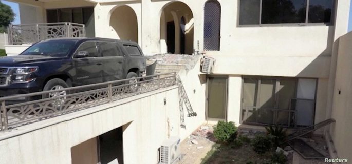 A general view of the destruction casued to Iraqi Prime Minister Mustafa al-Kadhimi's residence following an assassination attempt by an armed drone in Baghdad, Iraq in this screen grab taken from a handout video obtained by Reuters on November 7, 2021. PRIME MINISTER MEDIA OFFICE/Handout via REUTERS THIS IMAGE HAS BEEN SUPPLIED BY A THIRD PARTY. MANDATORY CREDIT