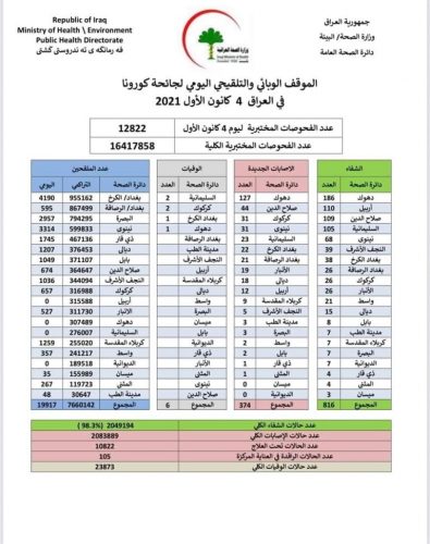 الصحة تسجل 374 اصابة جديدة بكورونا
