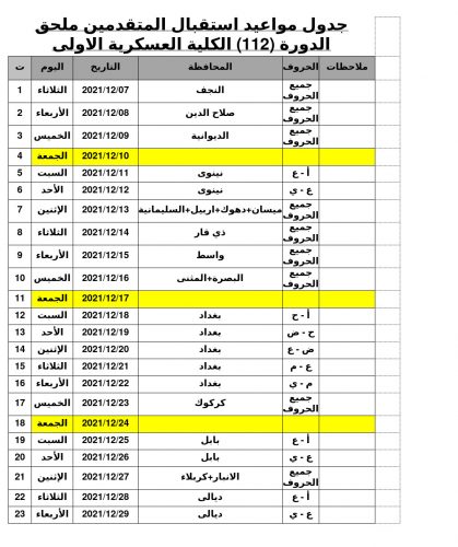 دعت وزارة الدفاع المتقدمين للدورة (112) الذين سبق وان قدموا على الموقع الرسمي للوزارة للفترة من 25/11/2021 ولغاية 29/11/2021 إلى مراجعة الكلية العسكرية الأولى في الرستمية ببغداد، وحسب جدول المواعيد أدناه مستصحبين معهم كافة المستمسكات الأصلية التالية مع نسخ عدد 4.