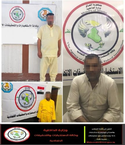 وقالت الوكالة في بيان تلقت *الرأي* الدولية نسخه منه أنه “استمرارا للعمليات الاستخباراتية النوعية التي تنفذها وكالة الاستخبارات والتحقيقات الاتحادية لضرب معاقل الارهاب وتجفيف منابعهم، فقد تمكنت وكالة الاستخبارات واستنادا لمعلومات استخباراتية من القاء القبض على ثلاثة ارهابيين مطلوبين وفق احكام المادة (٤/ ارهاب ) لانتمائهم لعصابات داعش الارهابي”.